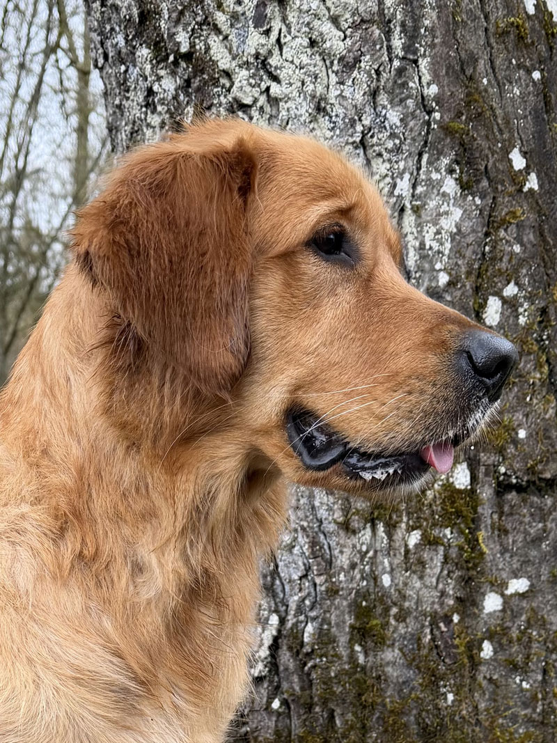 Golden-Hündin mit lebhaftem und aktivem Wesen. Sehr willig und in allen Situationen sicher. Zeigt großes Interesse am Fährtenlauf und verfügt über eine ausgezeichnete Nasenarbeit. Hat eine gute Bindung zu ihrer Besitzerin und schwimmt gerne. Bravo.